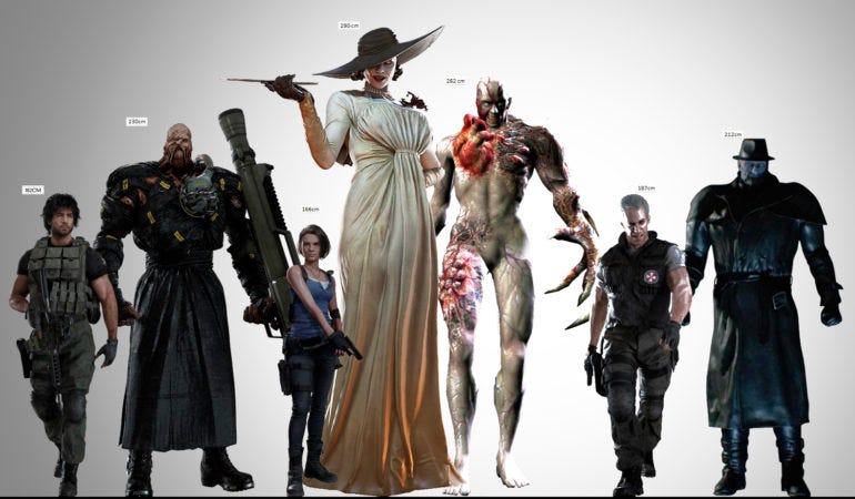 Falando em Nêmesis, o vilão de Resident Evil que carrega esse nome é menor que a Lady Dimitrescu, que estará no próximo jogo da franquia. Após a internet gerar bastante furor ao redor da personagem, a Capcom revelou que a vampirona possui 2,90 metros de altura. É uma ameaça e tanto.
