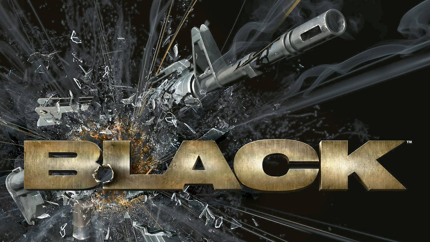 Lançado em 2006 para PlayStation 2 e Xbox, Black foi desenvolvido pela Criterion Games e publicado pela EA. O jogo ficou famoso por sua ação estilizada, efeitos de destruição impressionantes para a época e design de som de alto nível. Sua campanha apresentava o sargento Jack Kellar, envolvido em uma operação da CIA contra a organização terrorista Sétima Onda.